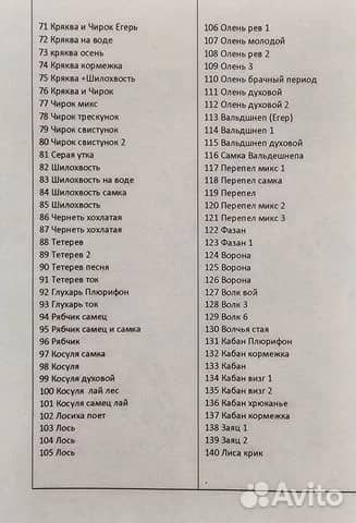 Олень самец - рев одиночки26. Гусь гуменник - стая зимующая73. Лось - рев27. Гусь гуменник - призыв74. Лось - рев одиночки28. Гусь гуменник - на земле75. Лось - рев29. Гусь гуменник - подлет76. Лосиха30. Утка кряква - призыв77. Лосиха - в течке31. Утка кряква - призыв78. Лось - ваба егеря32. Утка кряква - призыв на воде79. Лоси - случка33. Утка кряква - призыв на воде80. Лось - брачный рев34. Утка кряква - призыв на воде81. Лось - призыв35. Утка кряква - призыв на воде82. Кабан36. Утка кряква - осадка83. Заяц - раненый37. Утка кряква - весенний призыв84. Рысь38. Утка кряква - подлет85. Рысь - одиночка39. Утка кряква 86. Рысь - кормление40. Утка кряква + серая утка87. Рысь41. Утка серая88. Волк - стая42. Утка серая89. Волк - вой43. Утка широконоска90. Волк - вой стаи44. Чернеть хохлатая91. Волк - вой45. Свиязь92. Волк молодой - вой46. Чирок-свистунок93. Волк - одиночка47. Чирок-трескунок94. Волк - голодный48. Шилохвость95. Волк - вой