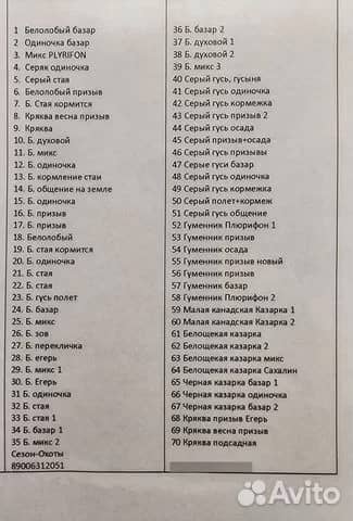 1. Белолобый гусь - призыв 2. Белолобый гусь - призыв49. Шилохвость3. Белолобый гусь - призыв50. Шилохвость4. Белолобый гусь - призыв51. Чернеть красноголовая5. Белолобый гусь - призыв52. Чернеть красноголовая6. Белолобый гусь - призыв53. Нырок красноносый7. Белолобый гусь - призыв54. Нырок красноносый8. Белолобый гусь - весенний базар55. Глухарь - токующий9. Белолобый гусь - весенний базар56. Глухарь10. Белолобый гусь - весенний базар57. Глухарь11. Белолобый гусь и гуменник - клич58. Глухарь12. Белолобый гусь и гуменник - клич стаи59. Тетерев13. Белолобый гусь - пара60. Тетерев14. Белолобый гусь - пара61. Вальдшнеп15. Белолобый гусь - одиночка62. Рябчик - самка16. Гусь гуменник - одиночка63. Ворона - пара17. Гусь гуменник - одиночка полет64. Ворона - перекличка18. Гусь гуменник - пара65. Косуля самец - "лай"19. Гусь гуменник - стая66. Косуля самка - призыв20. Гусь гуменник - перекличка67. Косуля самка - призыв21. Гусь гуменник - базар большой стаи68 Косуля - самец22. Гусь гуменник - базар небольшой стаи69. Косуля самец - крик23. Гусь гуменник - базар70. Косуля самка - призыв24. Гусь гуменник - базар на воде71. Олень самец - рев25. Гусь гуменник - базар в полете72.